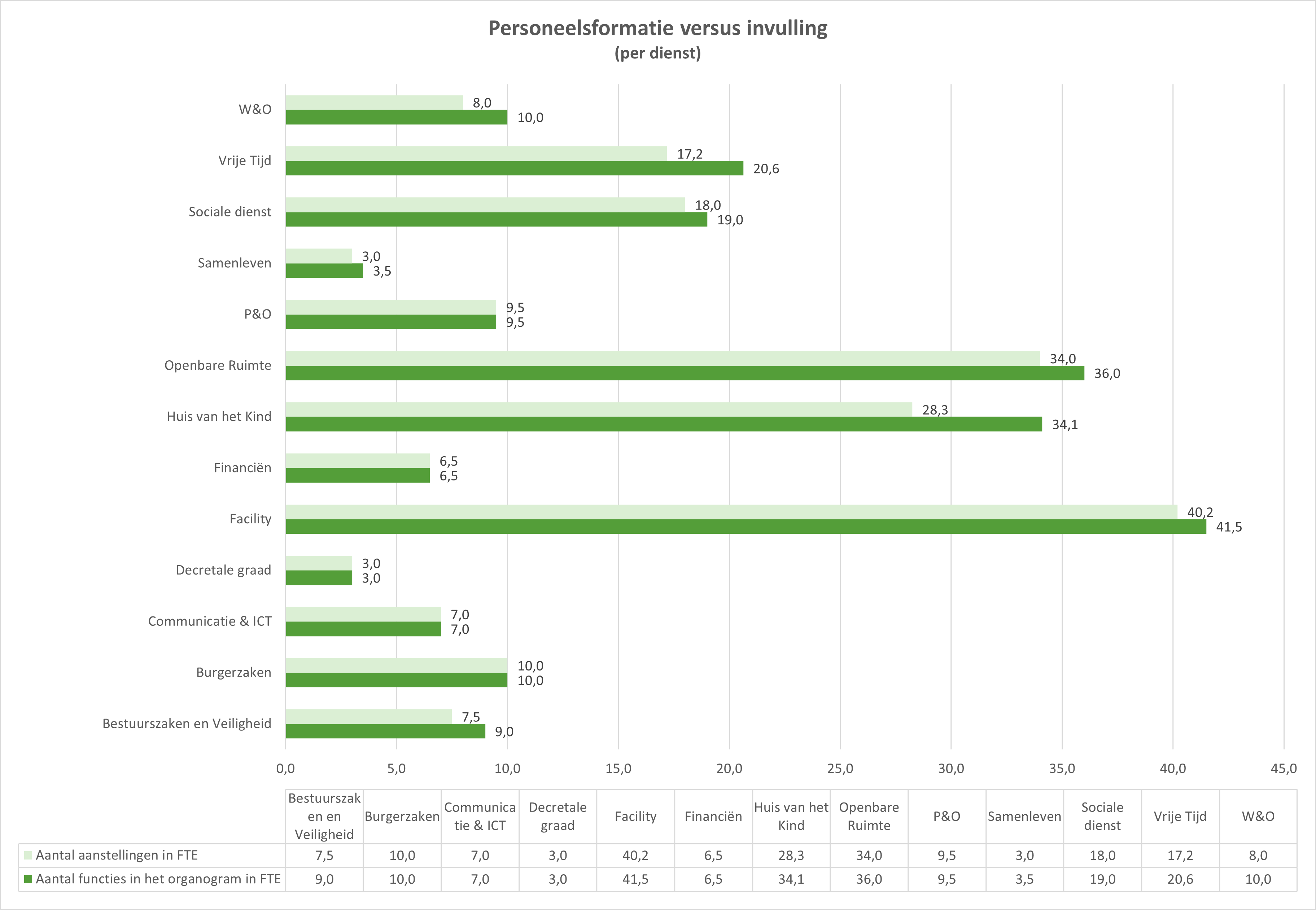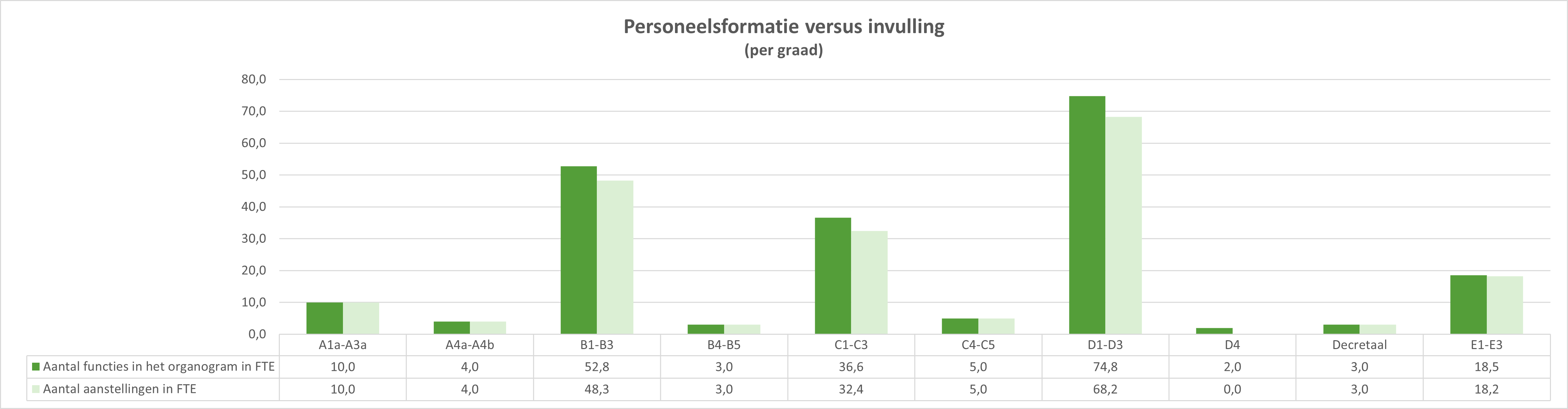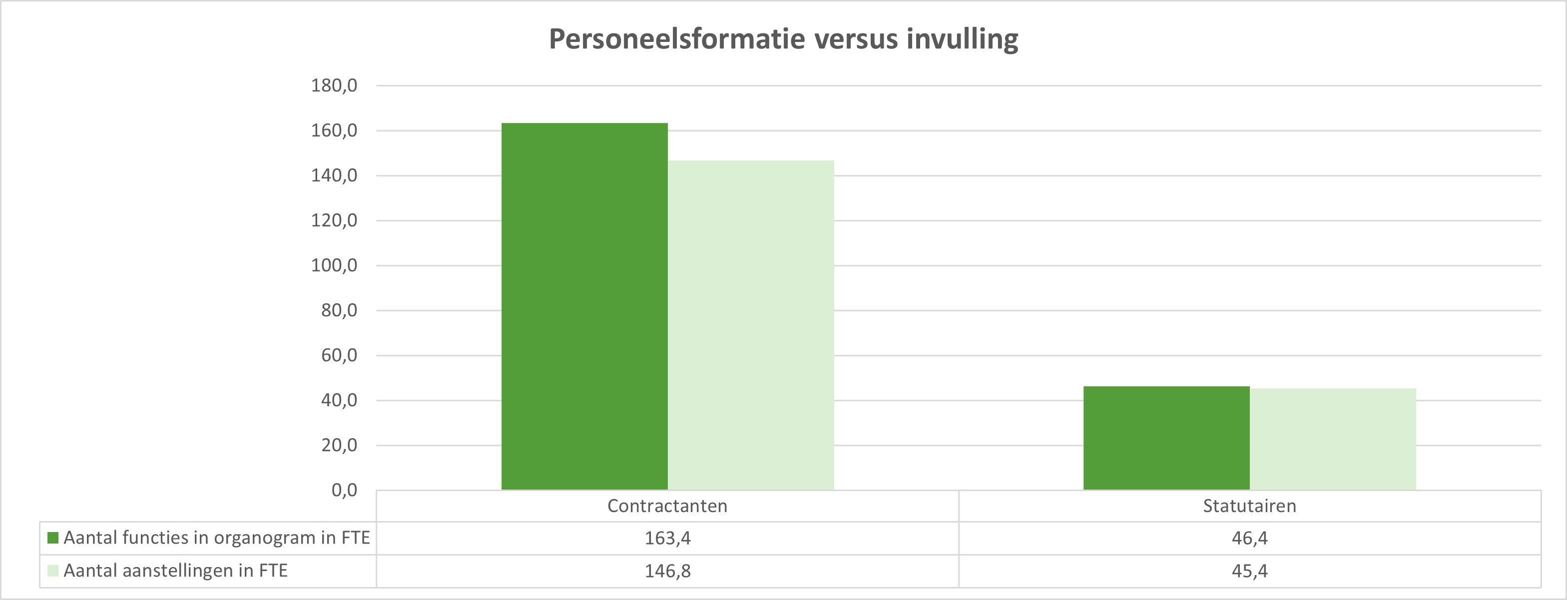 Onderstaande grafieken geven een beeld van de personeelsformatie (organogram) tegenover de daadwerkelijke invulling ervan. Het verschil tussen beide zijn de (openstaande) vacatures.