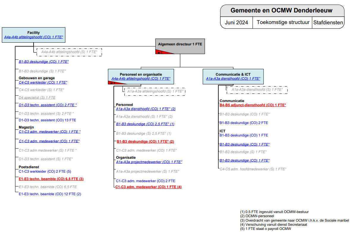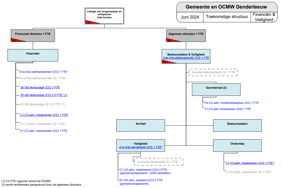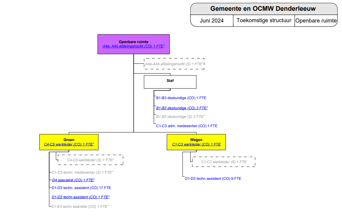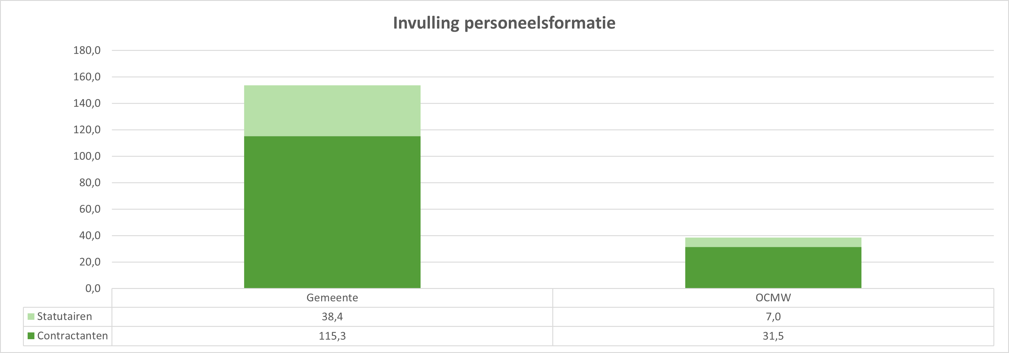 Het betreft cijfers van het personeelsbestand op datum van 1 oktober 2025, waarbij een foto werd genomen van alle definitieve aanstellingen (statutair en/of contractueel voor onbepaalde duur) van het aantal personeelsleden bij lokaal bestuur Denderleeuw. De tijdelijke contractuele aanstellingen zoals bv. aanstellingen van middagtoezichters en seizoenarbeiders zijn niet mee opgenomen in deze cijfers. Ook het aantal aanstellingen in artikel 60 via het OCMW is als tijdelijke tewerkstelling, veelal bij een andere organisatie, niet mee opgenomen in deze cijfers.