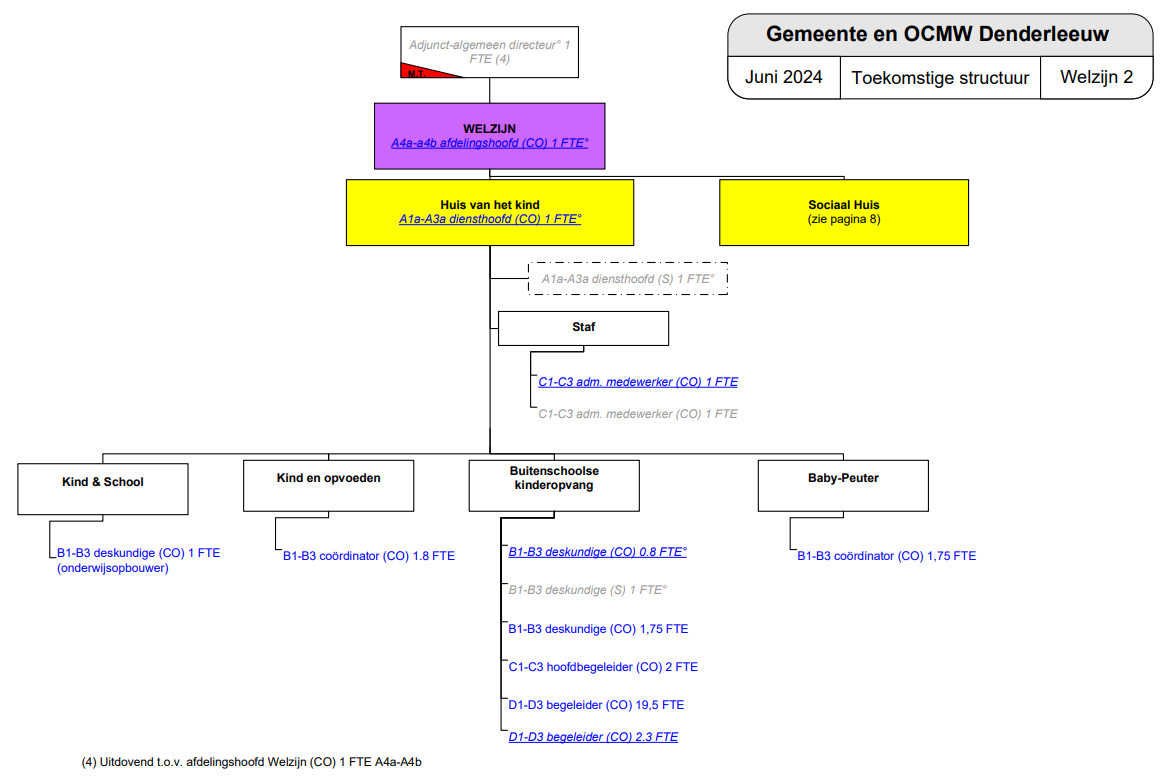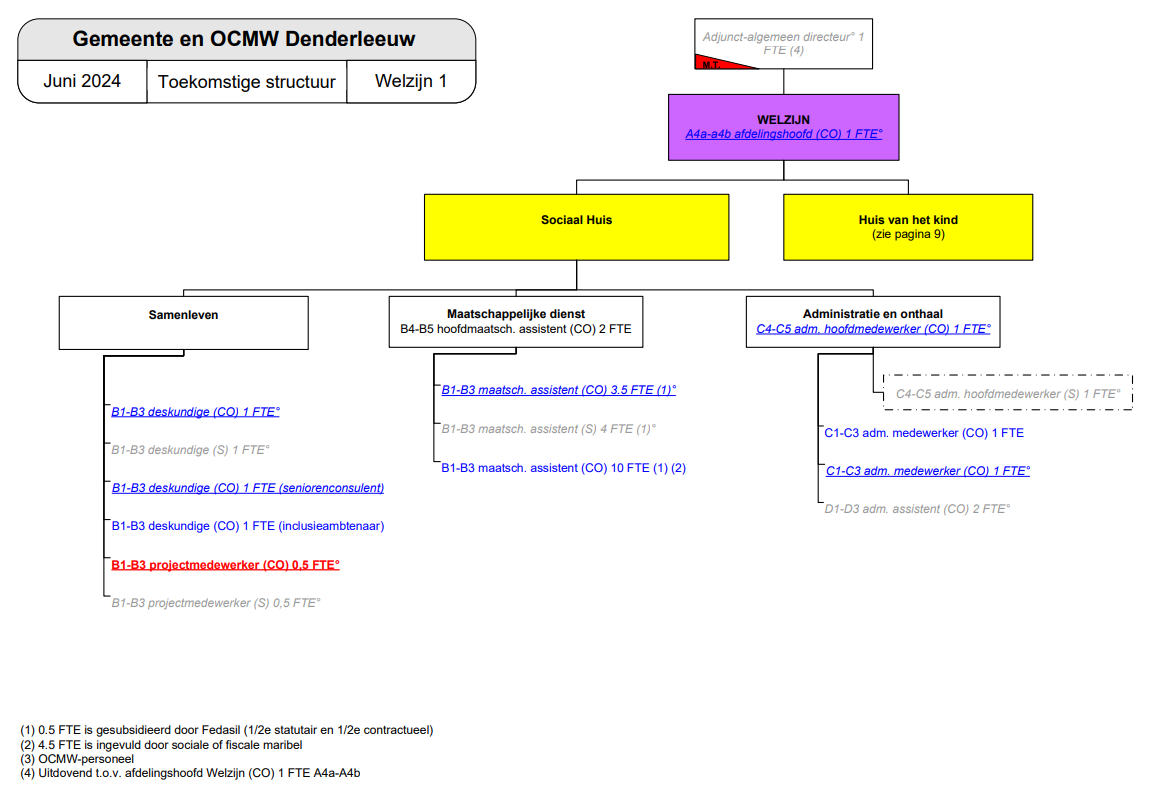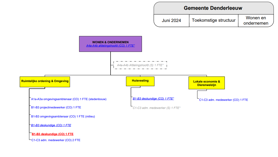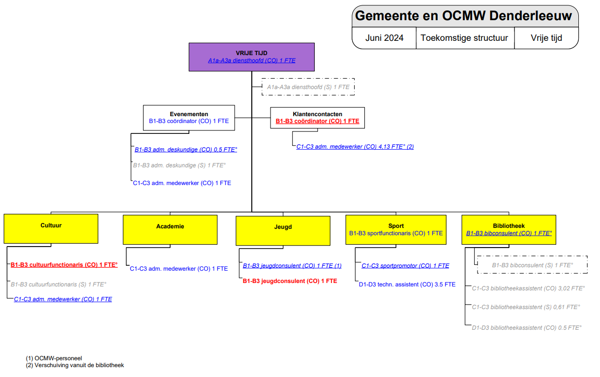 Het betreft cijfers van het personeelsbestand op datum van 1 oktober 2025, waarbij een foto werd genomen van alle definitieve aanstellingen (statutair en/of contractueel voor onbepaalde duur) van het aantal personeelsleden bij lokaal bestuur Denderleeuw. De tijdelijke contractuele aanstellingen zoals bv. aanstellingen van middagtoezichters en seizoenarbeiders zijn niet mee opgenomen in deze cijfers. Ook het aantal aanstellingen in artikel 60 via het OCMW is als tijdelijke tewerkstelling, veelal bij een andere organisatie, niet mee opgenomen in deze cijfers.