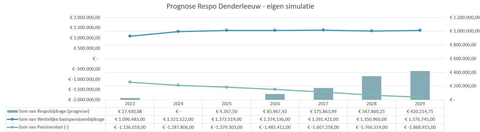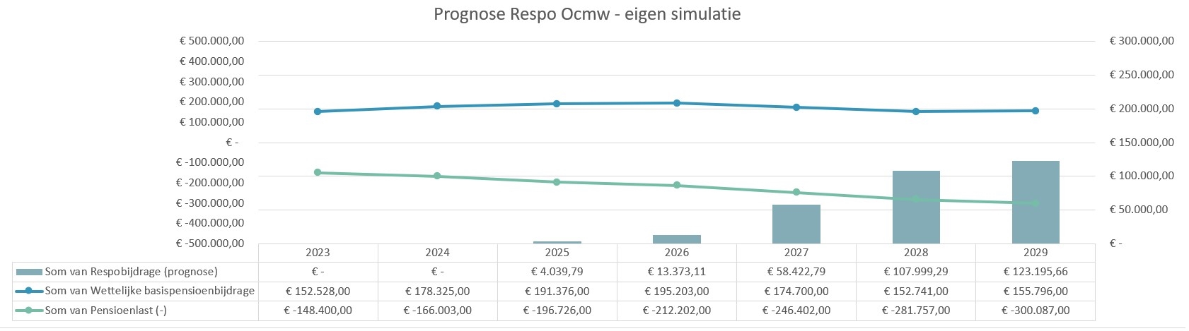 Grafiek: evolutie respo bijdrage 2020-2029 voor gemeente en OCMW op basis van de eigen simulatie 11/2024.