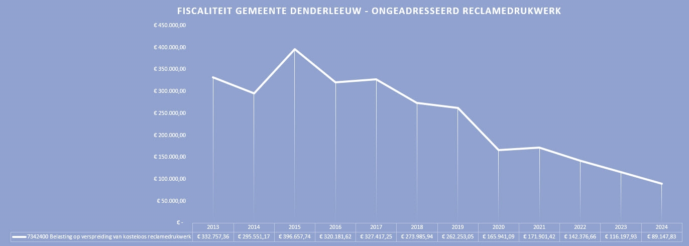 • De opbrengst uit de belasting op niet geadresseerd reclamedrukwerk staat onder druk. Vermoedelijk is dit het gevolg van een verschuiving naar andere communicatiekanalen voor het maken van reclame (sociale media, mailberichten, ...)