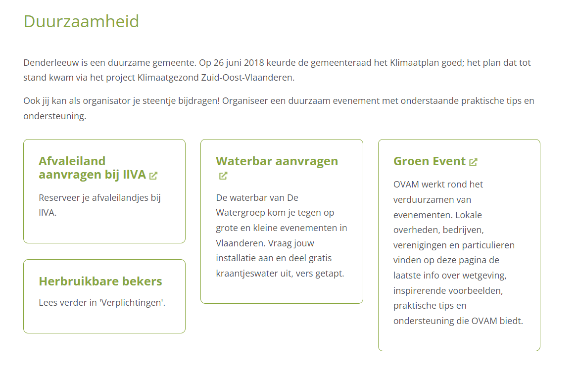 Bij de lancering van de nieuwe gemeentelijke website begin 2021 schonken we aandacht aan een webpagina rond duurzaamheid bij de organisatie van events. Hierbij wordt gewezen op de goedkeuring van het Klimaatplan in Denderleeuw en onze ambities als duurzame gemeente. Op de pagina bundelen we info over het aanvragen van afvaleilandjes bij Ilva, een Waterbar bij de Watergroep aanvragen, de verplichtingen rond het gebruik van herbruikbare bekers en hoe je een 'Groen Event' vorm geeft met tips vanuit OVAM. Evenementorganisatoren ontvangen steeds actuele informatie over duurzaamheidsmaatregelen aan de hand van de  webpagina rond duurzaamheid bij de organisatie van events.
