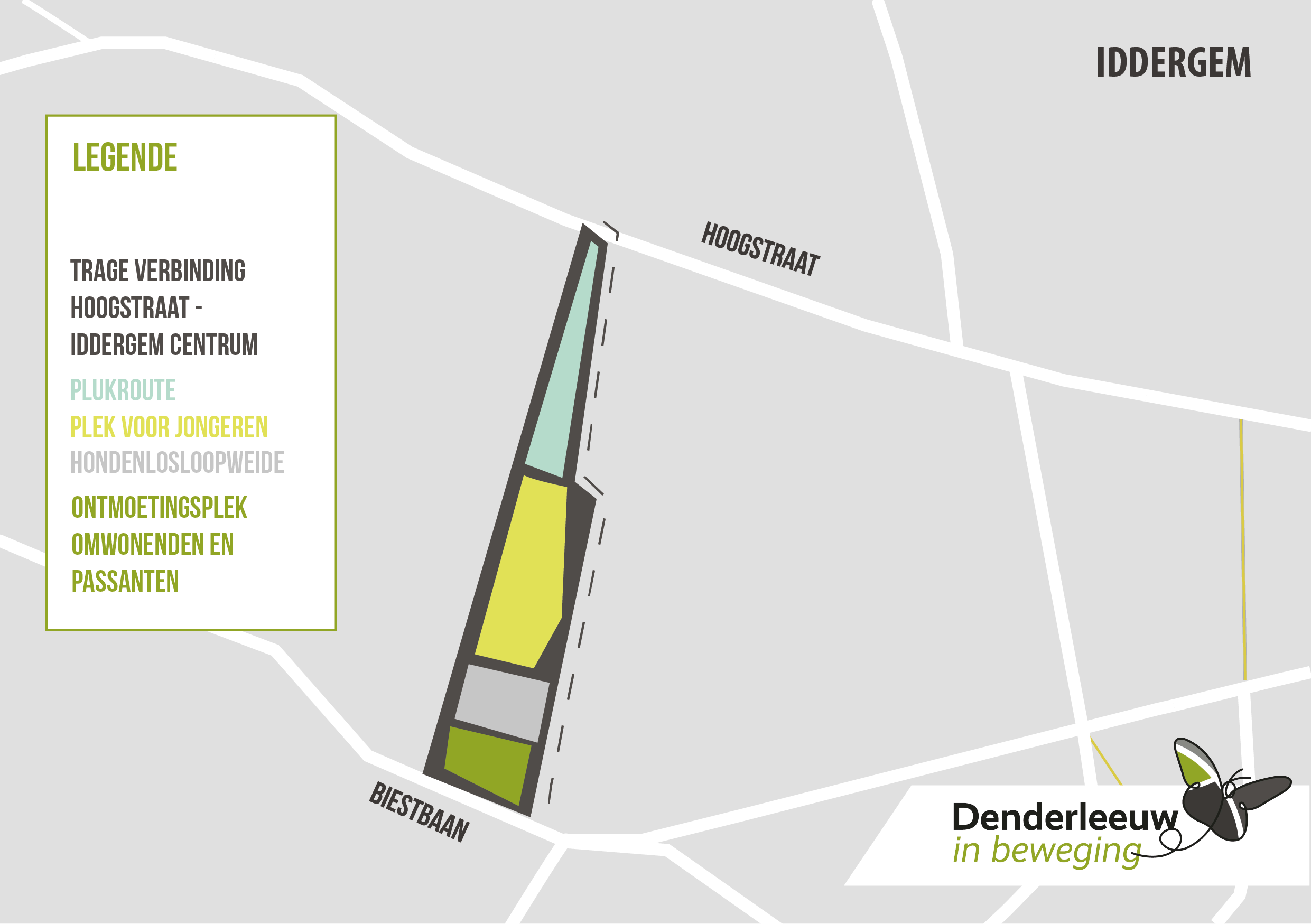 Het projectvoorstel dat Denderleeuw instuurde over de (jongeren)ontmoetingsplek aan de Biestbaan werd weerhouden. Door Atelier Romein werden praatplannen uitgewerkt voor de ontmoetingsplek en voor het dorp, dit in co-creatie met inwoners van Iddergem. Het resultaat daarvan werd in 2022 verder uitgewerkt en verfijnd. In elk ontwikkelingsalternatief werd de inplanting van een hondenlosloopweide weerhouden.